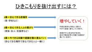 しかし今、支援する側で不登校や引きこもりに関わっていると、実は引きこもりを脱出するにはこの基本を大事にして実現してく事が有効だと気付いたのです。